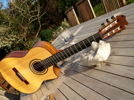 Cette superbe guitare est liée à un rêve à deux : l'un des deux est passé du côté du rêve et la présence de cette guitare n'ayant plus de sens entre mes mains, je l'ai cédée à un couple d'amis et je suis sûr que, ensemble, elle violoniste et lui guitariste, ils sauront la faire vibrer à l'unisson de leur beau partage.